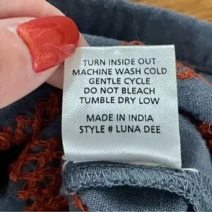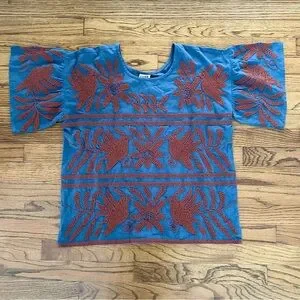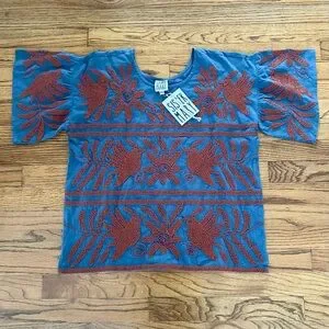 This is a Sister Mary brand Luna Dee top in a women’s size Small / Medium. Top is made of grey / blue colored cotton fabric with rust colored embroidery. The embroidery is so beautiful and makes it look so unique! Top is brand new with tags.