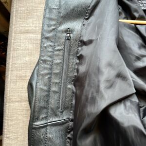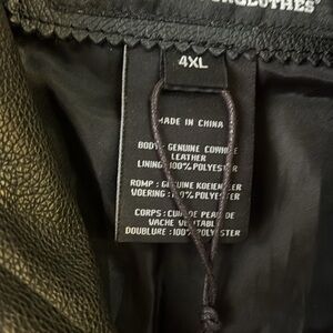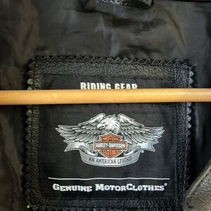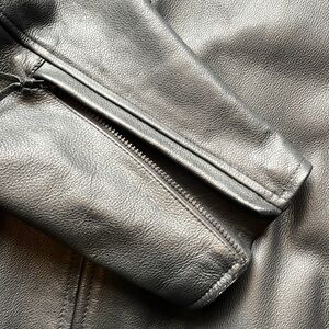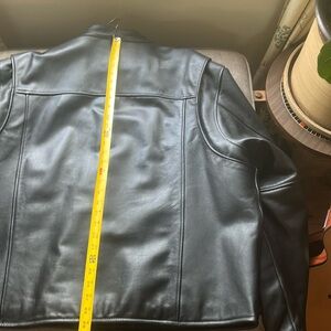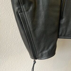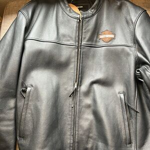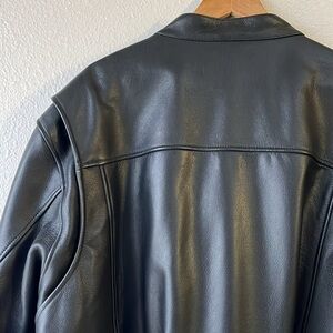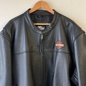 Black leather jacket by Harley Davidson. Has a little scuff near the bottom of the front zipper, otherwise, excellent condition. Size 4XL, approximately 30.5” pit-to-pit lying flat, 30” from the top of shoulders to bottom hem. Has 3 zippered pockets and is fully lined.