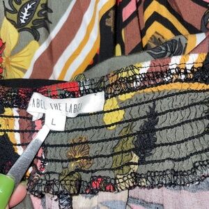 Abel The Label Floral Geometric Print Maxi Halter Top Sleeveless Dress Sz L, Colorful and free-flowing, this Abel The Label maxi dress features a unique floral geometric print, perfect for warmer days and casual outings, Floral geometric print, Fitted waist Smocked waist, Open back, Lightweight material, Perforated Detail on the chest area, approx 21inch front slit, Shark Bite hem, tie back detail in the back, 2 mother pearl button closure in the back, not lined, light stretch, Great pre owned condition.
