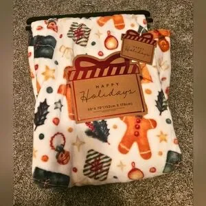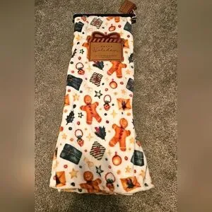 Brand New with tags and original hanger. This absolutely adorable and beautiful plush throw blanket is 50 x 70. Has gingerbread men on it, presents, Holly, bells etc. Absolutely adorable! Perfect gift idea