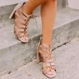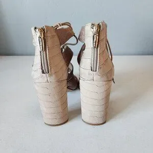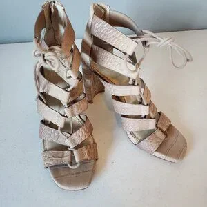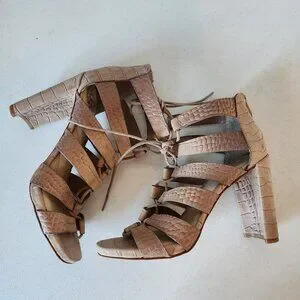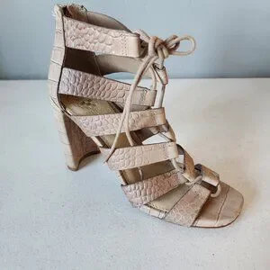 "NEW" Fantastic Tan Croc Embossed Leather Gladiator Style Sandals By Vince Camuto. Lace Up Style with Back Zip Entry, Cushioned Foot Bed Squarish Toe, Wrapped 4" Heel & Man Made Soles, New, Tags, Only Tried On, Minor Markings Normal Retail Environment:) Rt.139.00 approx. Size 7.5, Foot Bed Measures 9.5" for Reference.