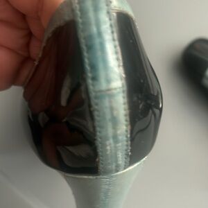 The patent leather is a dark navy blue with light blue contrasting detailing and bows