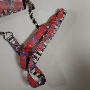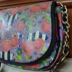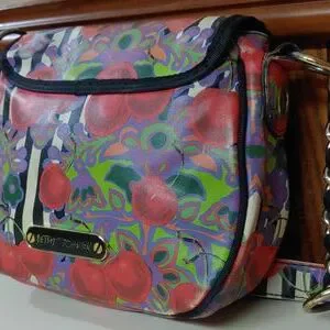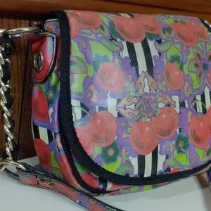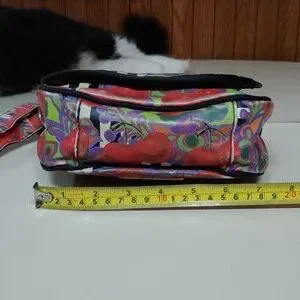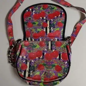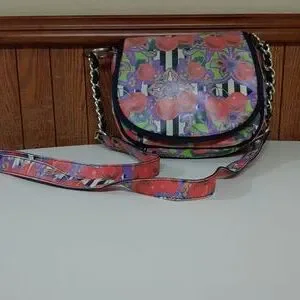 Gently used in great condition! Front in a little faded. There is very minor wear on the shoulder strap and the ribbon has unglued itself on one side,. Please see last pic closely. Magnetic close. Inside has one zipper pocket and one small slip pocket. Crossbody strap is not adjustable.