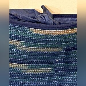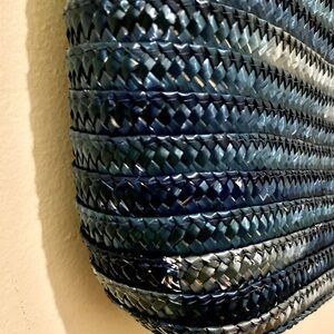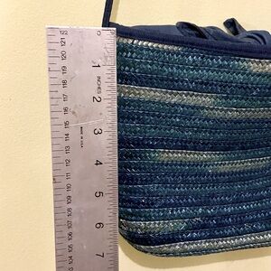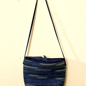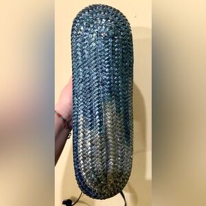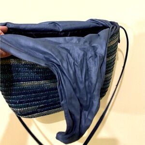 This is a really unique vintage piece! Beautiful ombré blue straw / rattan purse from Holy Renfrew, with waxed canvas flaps that can be tied together as a closure— so gorgeous and feminine. The thin but sturdy shoulder strap can be easily knotted to adjust the length. There is a small interior pocket with the Holts label, and the gold tone zipper looks quite old— I would guess this piece is from the 70s, or early 80s at the very earliest. Made in Italy