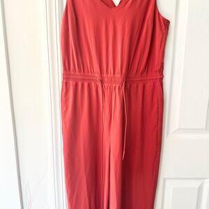 Size 6 from Athleta. Style name Savannah. Currant red sleeveless racerback ruffle strap wide leg jumpsuit. Drawstring waist. Preowned in good condition with no stains or tears.