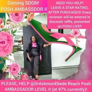 I am a Posh Ambassador, 100K! Posh Ambassador II soon at 99%. In addition, I am a Top Recruiter, Top 10% Sharer, Posh Mentor as @DrAshmonEbede. Thank you for visiting boutique. A portion of proceeds are provided to church & community programs. As a Philanthropist, I focus on feeding the hungry school-based programs, the displaced in communiities as well as to augment Holistic Consultation fees for some patients in need.