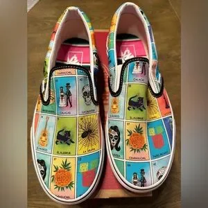 Brand new in box, Vans classic slip-on shoes with Don Clemente Loteria print. These were limited edition and hard to find.