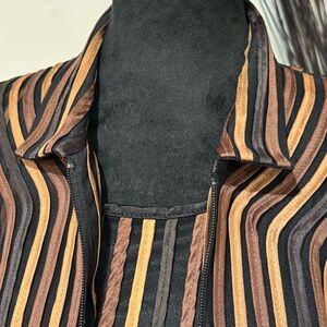 This two piece set by Damee, Inc, features a medium tank top and matching jacket. Both pieces display a striking striped design in rich tones of black, brown and tan with intricate cutout patterns along the hem of the jacket. Lightweight. Suitable for layering or semi formal occasions. Excellent condition.