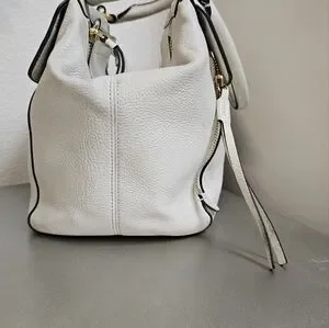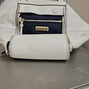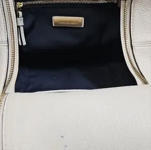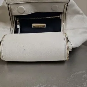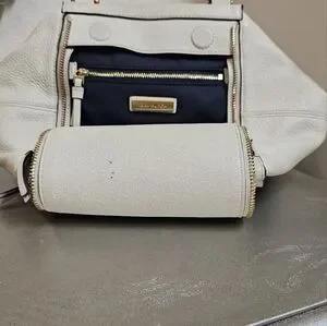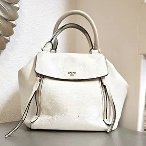 The bag's exterior is designed with beautiful cream leather and features a solid pattern with gold hardware. It has a large size, measuring 16 inches in width, 11.5 inches in height, and 8.9 inches in depth. The bag has a zip closure. The bag's interior is lined. The Tory Burch brand is well-recognized for its status, its use of high-end materials, and it is perfect for any occasion.