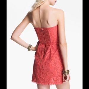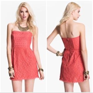 Women's Free People "I Love Lace" strapless dress. In size 12. Color is Strawberry (pink salmon color)