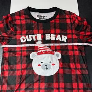 Style: Long sleeve cozy warm fleece pajama top in black and red buffalo plaid, cute Christmas Santa Bear applique