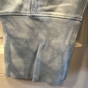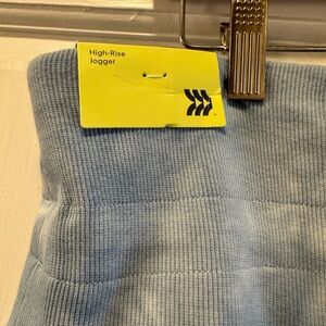 Blue and white tie-dye joggers with side pockets and drawstring waist.