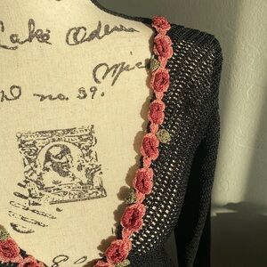 Adorable 90s knit cardigan from Marina by Marina Bressler. Loose, lacy black knit, Hutton front, and crocheted rosettes at neckline. Missing interior tags, likely an acrylic knit. Fits size S/M.