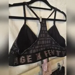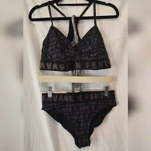 This two-piece set from Savage x Fenty is great for relaxing or as undergarments. The cotton makes it super comfy and soft. a The gold sparkle on the bands adds a little pizzazz. The. ands are wide, which keeps it from rolling, and it is great for comfort. The palette is a large, and the bottoms are medium. Can be purchased as a set or individually. Set price $40 Bralette only $30 Panty only $20. NWT