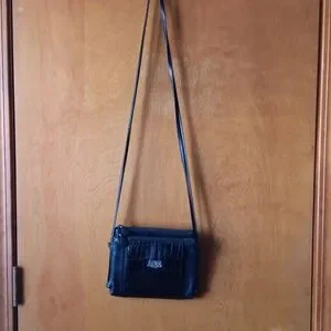 Brighton black textured leather crossbody organizer with croco patent pocket on the front. Small, slim profile, 2 zippered pockets with center wallet organizer compartment. Double straps, Brighton silver deco on front pocket, leather heart zipper tabs. Like new, immaculate lining, no blemishes.