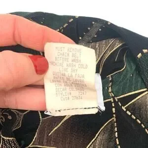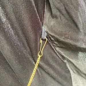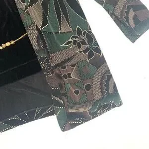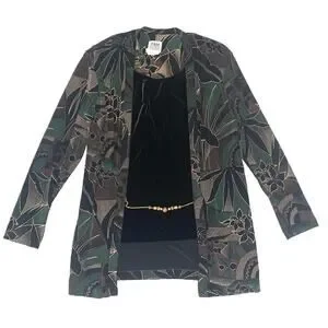 R&M Richards two piece set with attached open jacket and black velvet top, removable decorative chain belt, displayed on size medium (8-10) dress form, good preowned condition, gorgeous versatile top and jacket set