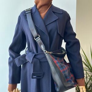 Crafted from polyester with cowleather trims, this hobo bag features an intricate navy and red check pattern throughout.