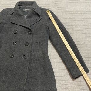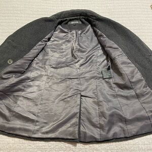 Kenneth Cole Reaction Gray Wool Blend Double Breast Jacket Pea Coat Size 2 | pre-owned condition, two tears in the lining and broken button however there is a replacement button on the inside of the coat | Measurements shown in photos above