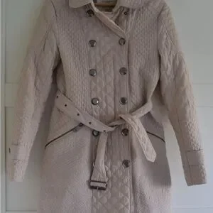 Burberry women coat size large but fit more like a medium in great condition with one problem one of the snaps at the top is missing but it doesn’t take away the beauty of this Burberry coat.