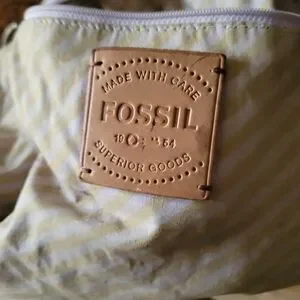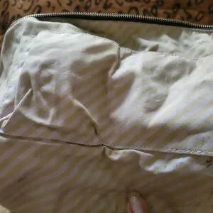 Black Leather with brown leather straps. 2 side pockets, 3 inside pockets and one has zipper. Both inside and closure zipper in perfectly working condition. No tears inside or outside. Inside has faint pencil stains