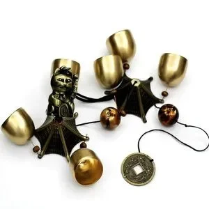 Enhance your meditation space. A Japanese lucky neko cat sits above a pagoda roof that protects 3 small golden wind chimes with a soothing Zen like tone. Hanging down is a long beaded string with a weighted coin at the very end.