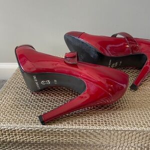Striking red patent leather shoe with reptile trim on toes and strap. Known for making a statement with his designs, Gianni Bini does not disappoint with these “look at me” must have shoes.
