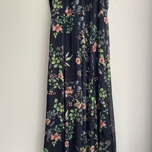 Sleeveless with a haltar neckline. Multicolor granny floral print on black polyester chiffon. Concealed zipper. Gently worn. No stains or rips. Smokeless home.