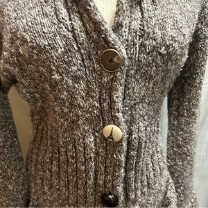 Cool long sweater with a tweedy look. Brown, tan, & white. 55% cotton & 45% acrylic. Measures 18" pit-pit & 37" from shoulder-bottom. Sweater has a collar, pockets, & buttons up the front with a mix of different buttons. Good used condition.