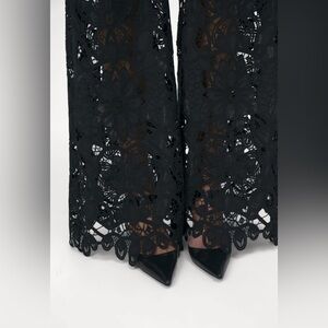 Black trousers made with beautiful lace see-through details on the legs. The pants are designed for a loose fit, with slit pockets, belt straps, and raw edges at the bottom.