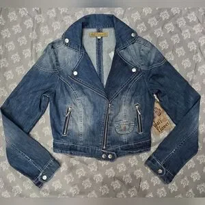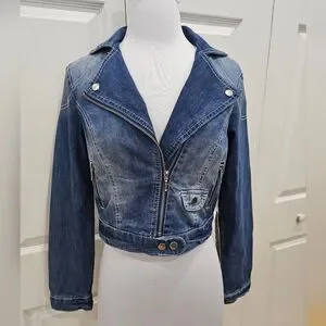 Wet Seal Wall Flower Distressed Blue Denim Zip Jean Moto Jacket Coat S