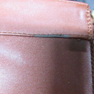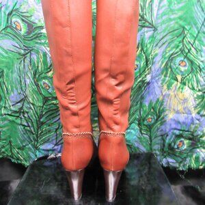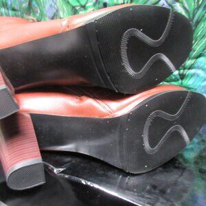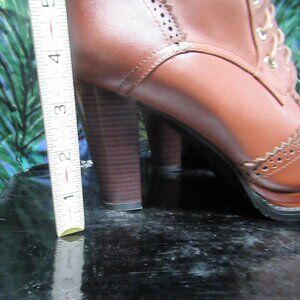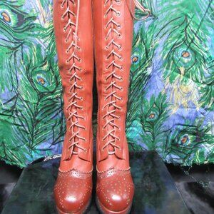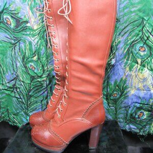 Vintage Look Cognac Sheepskin + PU Leather Lace Up Stacked Heel Knee High Boots. New, never worn. Slight peeling at a couple of the seams as shown in photos. Beautiful boots!