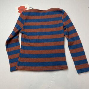 New Bobo Choses rust and blue striped long sleeve. The front reads “Open! Pail's Summer Fruit Wagon B.C.”. New with tags, size 6-7