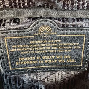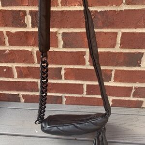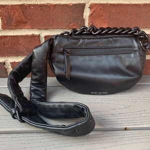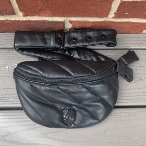 Belt bag from Kurt Geiger!! Features quilted styling, double zipper pulls in front, zipper pocket in back, adjustable strap with black chain detail, black jeweled signature bird head, and made from 100% leather with 100% signature logo lining. New condition, no tags, as pictured. Approx measurements: 6"H x 9" W. Black. Firm price!!
