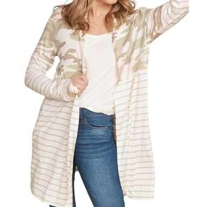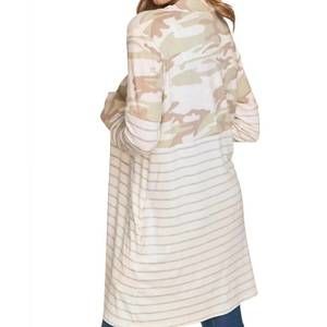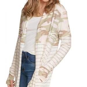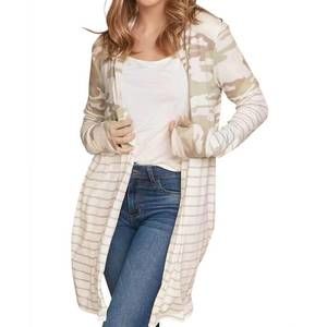 The Camo and Stripe Cardigan features an open front design and long sleeves, combining a trendy camo and stripe print for a unique look. This lightweight cardigan is equipped with convenient side pockets, adding both style and functionality. Perfect for layering, it offers a relaxed fit that makes it an ideal choice for casual outings or cozy days at home.