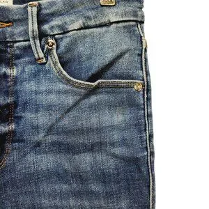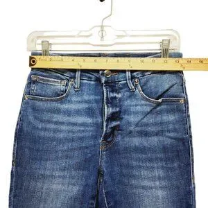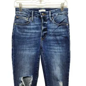 These distressed skinny jeans by Good American are crafted from a premium blend of cotton, recycled polyester, and elastane to ensure both comfort and durability. The jeans feature stylish rips on the legs, adding a touch of edgy fashion to any wardrobe. With a size of 4/27, these jeans are designed to flatter the figure while providing a comfortable fit.