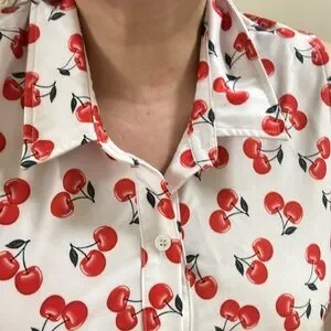 Knee length shirt dress with button front and pockets, smooth fabric with a fun cherry print