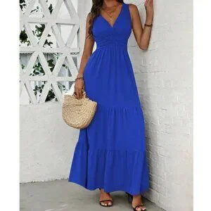 Boho V-Neck Pleated Waist Dress Blue
