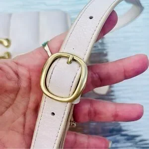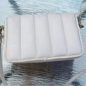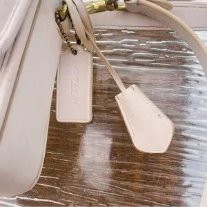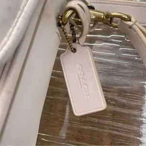This Coach Studio crossbody bag is a stylish addition to any outfit. With an off white leather exterior and brass hardware, it exudes elegance and sophistication. The bag features a quilted finish, adding depth and texture to the design.