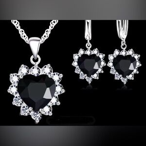 Sterling Silver Cubic Zirconia Black Heart Earrings Necklace Set