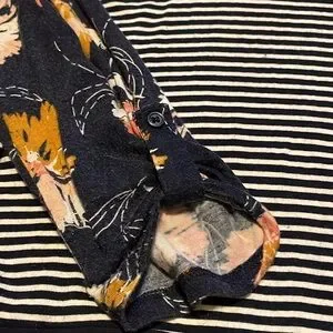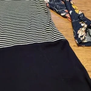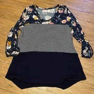 Maurice’s tee, 3-4 length sleeve with button detail, size large, features pink/white/mustard floral, navy/white stripe and navy solid fabric, longer style
