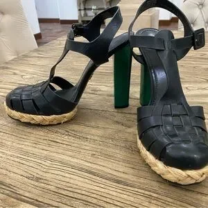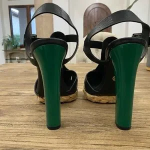 Stylish black strappy heels with a unique green block heel and woven platform. Absolutely love but too small for me. Never worn. Has smallest imperfection / scuff on inside of right heel but only noticeable up close in certain light. See photos