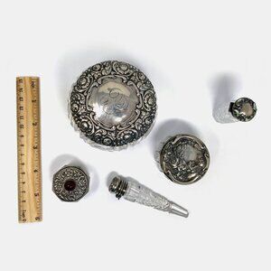Antique Victorian Cut Crystal With Sterling Silver Lids Collection. No major chips or cracks, some flea bite chips. Includes a Vanity Jar, Patch Jar, Lay Down Scent Bottle, Scent Bottle, and Powder Jar.