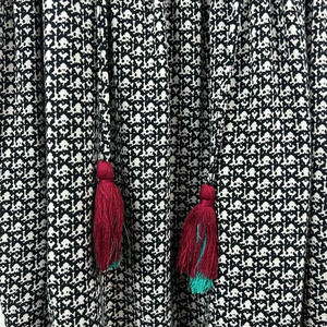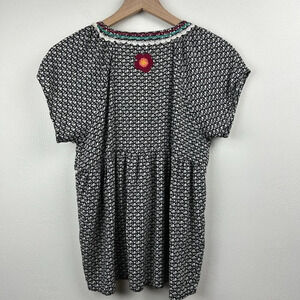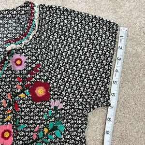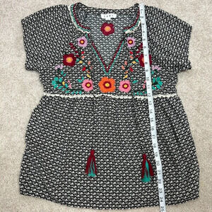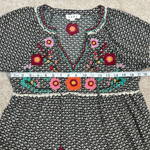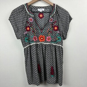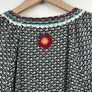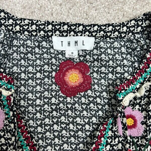 THML womens blouse in a beautiful black and white pattern with embroidery and crochet details in multipla various colors, size small. Tassel details on the front. Material is lightweight and flowy. Cap sleeves. Pre-owned in excellent condition.