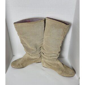 The Ugg Slouch Abilene boots feature a perforated leather design that adds texture and breathability. These knee-high boots offer a relaxed fit with a pull-on style, suitable for casual wear.