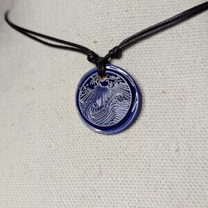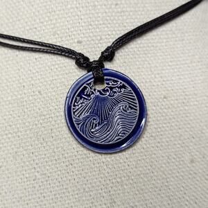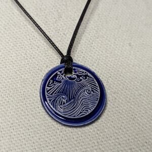 This ceramic pendant is a unique and handmade item that features a ocean waves and sky pattern in a faux wax seal pattern This pendant is made of ceramic material, which is known for its durability and long-lasting properties. These are made by hand, glazed and kiln fired