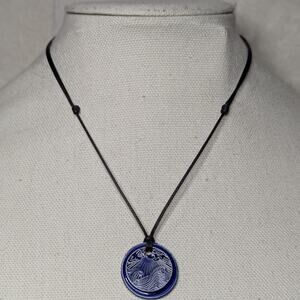 Blue Handmade Ceramic Ocean Waves Faux Wax Seal Pendant Y2K Boho Hippie Whimsical Choker Adjustable Black Corded Necklace Clay Charms Jewelry