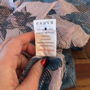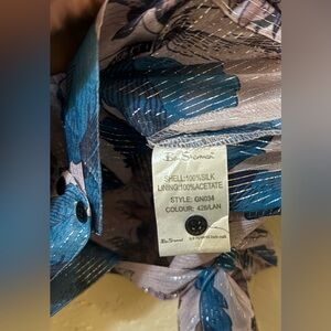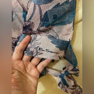 Ben Sherman Women’s 100% Silk Button Up Floral Blouse Medium Lavender and Blue with silver pinstripes. Features 3/4 sleeves and a belt that ties in the back.
