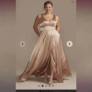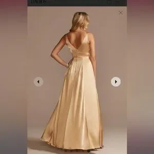 This stunning charmeuse tank V-neck bridesmaid dress from David's Bridal is the perfect choice for any bridal party. The sleek and elegant design features a flattering V-neckline, triangle waist, and a subtle slit that adds a touch of sophistication. The charmeuse fabric drapes beautifully, creating a luxurious look that is sure to turn heads. Whether you're a bridesmaid or a guest at a wedding, this dress is a versatile option that can be dressed up or down depending on the occasion.