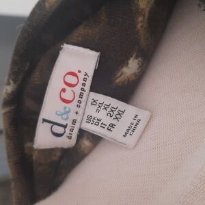 denim&co. tunic brushed knit 3/4sleeve. pretty rose print in green white. ptp is 27. shoulder to hem is 31. 96 poly 4 spandex. like new condition.