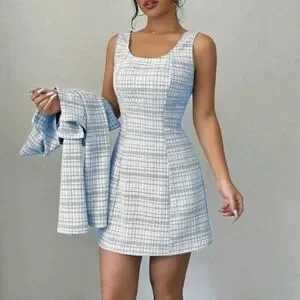 Women's Plaid Print Button Front Long Sleeve Jacket & Round Neck 2 peice set